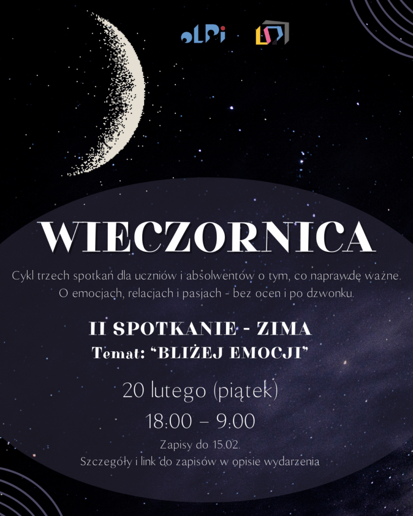 Zapraszamy na drugie spotkanie z cyklu wydarzeń pod nazwą WIECZORNICA, poświęcony tematom nam bliskim. Spotkajmy się bez ocen i po dzwonku.